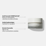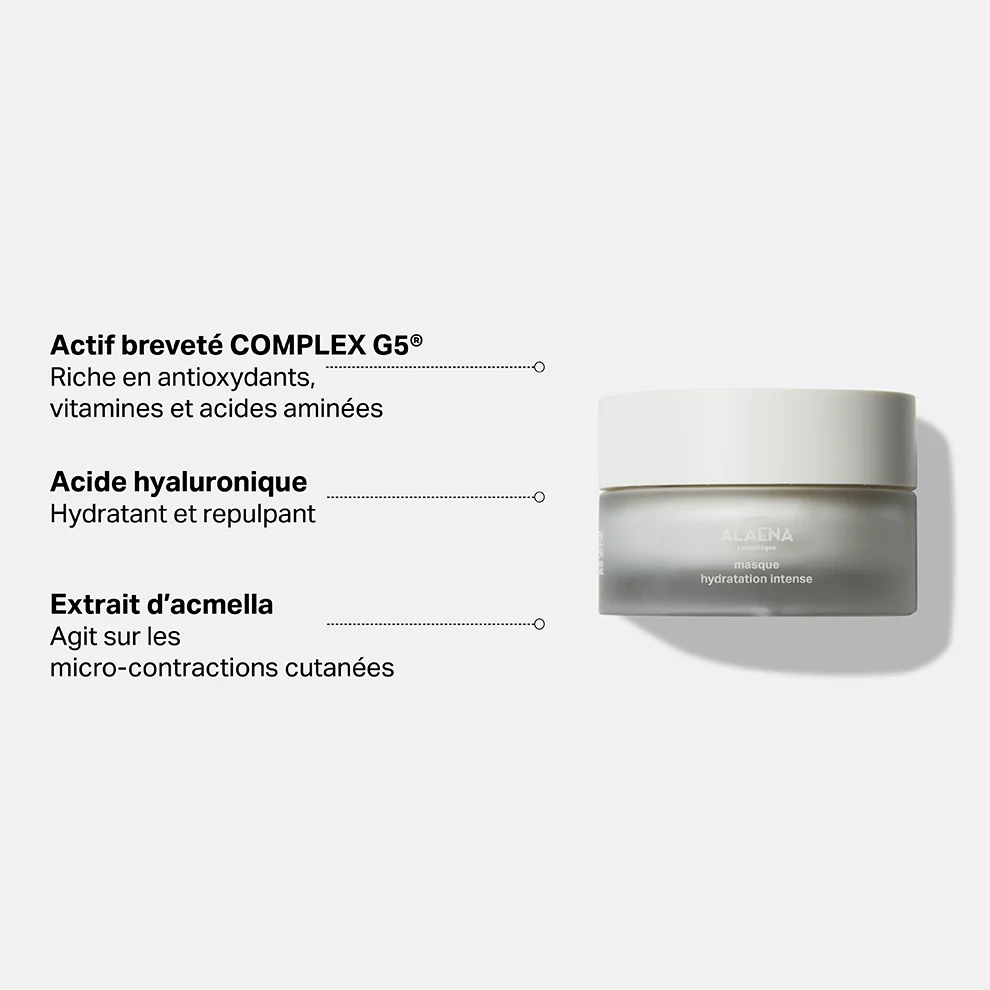 Le Masque hydratation intense contient de l’huile de prune, de cameline, de périlla et de pépin de raisin, ainsi que de la cire d’abeille et du beurre de karité associés à des actifs hydratants tels que des extraits d'algues rouges pour relancer la production de collagène ainsi qu’un extrait de framboise repulpant.