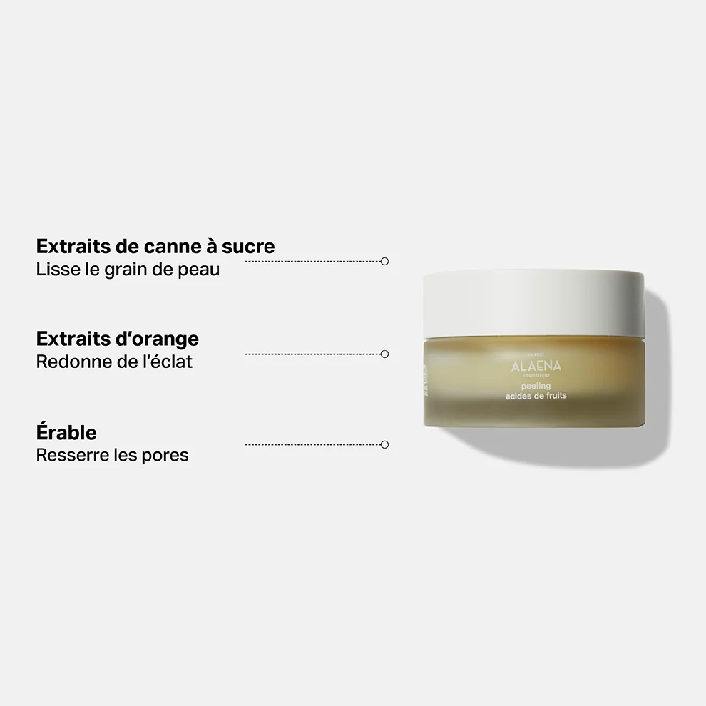 Le Peeling acides de fruits accélère le renouvellement cellulaire, lisse la surface de la peau, resserre les pores, affine le grain de peau, estompe les ridules et redonne à la peau tout son éclat grâce aux Alpha Hydroxy Acides naturellement extraits de fruits.