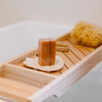 Disposer le Savon Mangue & Avocat sur le Porte Savon Coquillage en grès blanc. L'évacuation de l'eau par la céramique percée, permet une meilleure conservation du savon pour une utilisation durable.